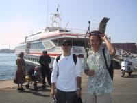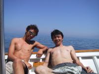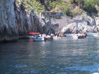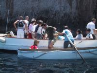 | カプリ港に到着。青い洞窟行きのボートの上で。15人乗り位の大きさで1人10000リラ・約600円位。「結構安いんだねぇ」って誰もが思う。→ | ![]() |