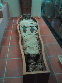 | バチカン美術館の中のミイラでございます。写真撮るのはちょっと戸惑ったけど撮ってしまった。 エジプトに何百年も置いておくと水分だけ上手に抜けて完全なミイラになるのですね。 |