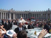 翌日は水曜日だった。水曜はローマ法王が謁見の日。朝からジリジリと背中が焼けていくのが分かるくらい暑い。待つこと30分。「パパ」(イタリアではこう呼んでいる)がオープンのジープに乗って登場。 とにかく凄い人の数だった。 |
