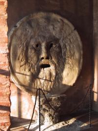 | そして、歩いて「真実の口」へ。 地図上では到着しているはずなのに 見当たらない。5分位周りをウロウロ しているとイタリア人の家族が牧師さんらしき人に「1分だけお願いします」 っと、何やら交渉している。っと良く見れば鉄格子の中にあるではないか、真実の口が。しかし、営業時間?を 過ぎていたので中には入れず鉄格子の隙間から手を伸ばして写真だけ撮ってきた。 ナムコの「ナンジャタウン」のパクリ だ・・・っと思ってたらナムコのゲームがこれをモデルにして作ったのね・・ |